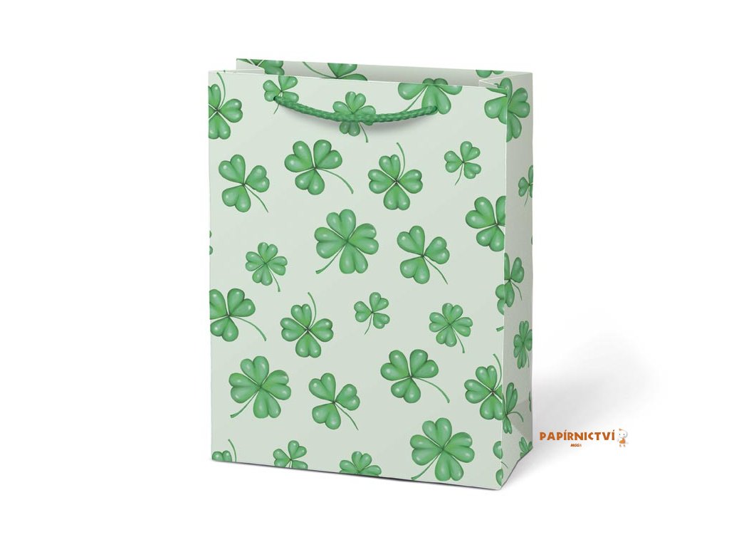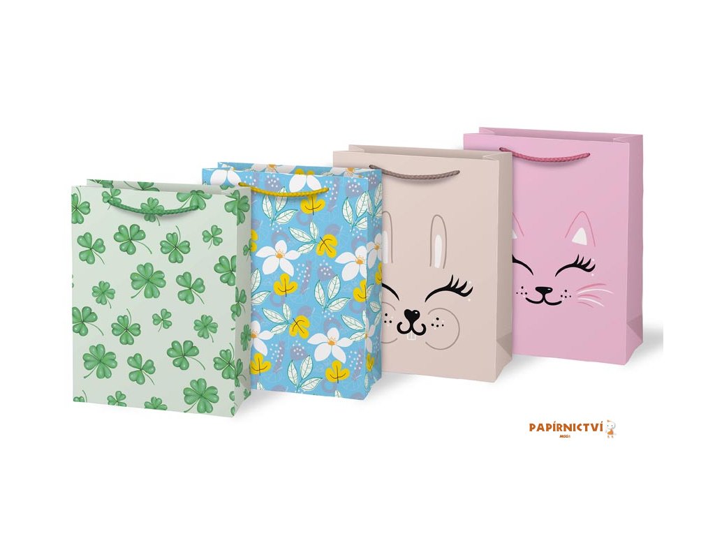 Taška je k dispozici v různých motivech, které spojuje radost a nápaditost. Ať už zvolíte jemnou květinovou variantu, veselý motiv se čtyřlístky, nebo některý z roztomilých zvířecích obličejů, každý z nich vnese do obdarování kousek hravosti a originality.