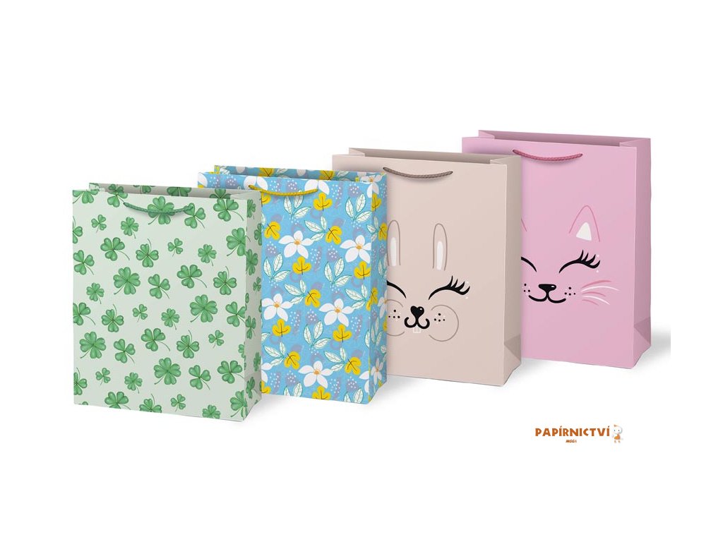 Kouzlo v každém detailu!Překvapte své blízké stylově! Tato prostorná dárková taška zaujme veselým a hravým designem, který okouzlí děti i dospělé. V mixu motivů – roztomilý zajíček, usměvavá kočička, jemné květy i čtyřlístky pro štěstí – si každý najde svého favorita.