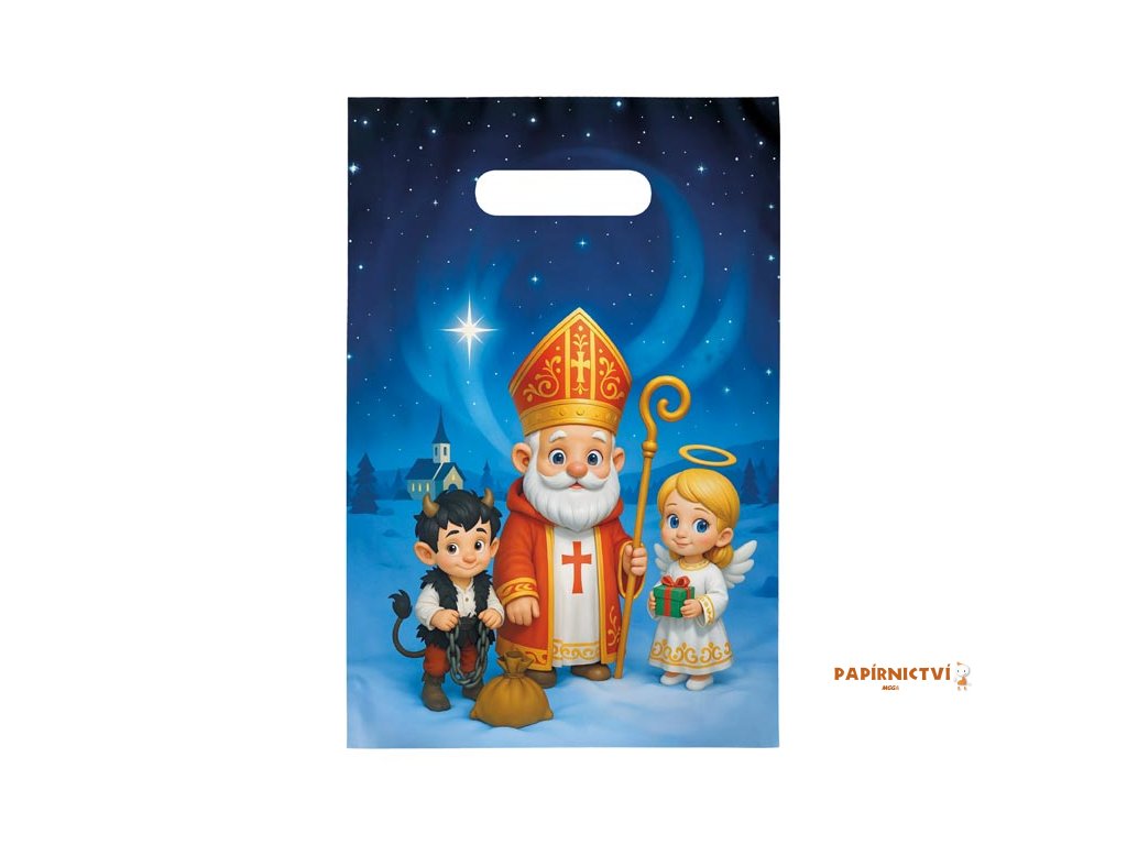 Taška MFP Mikuláš S – krásné balení pro sváteční překvapeníVneste do svátečního období kouzlo tradiční mikulášské nadílky s originální mikulášskou dárkovou taškou MFP, která potěší malé i velké. Tento veselý motiv Mikuláše, anděla a čertíka na zasněženém pozadí pod hvězdnou oblohou rozzáří každý balíček a dodá mu tu pravou sváteční atmosféru.
