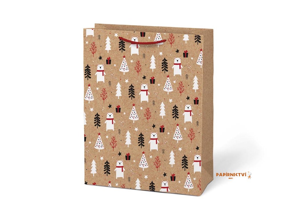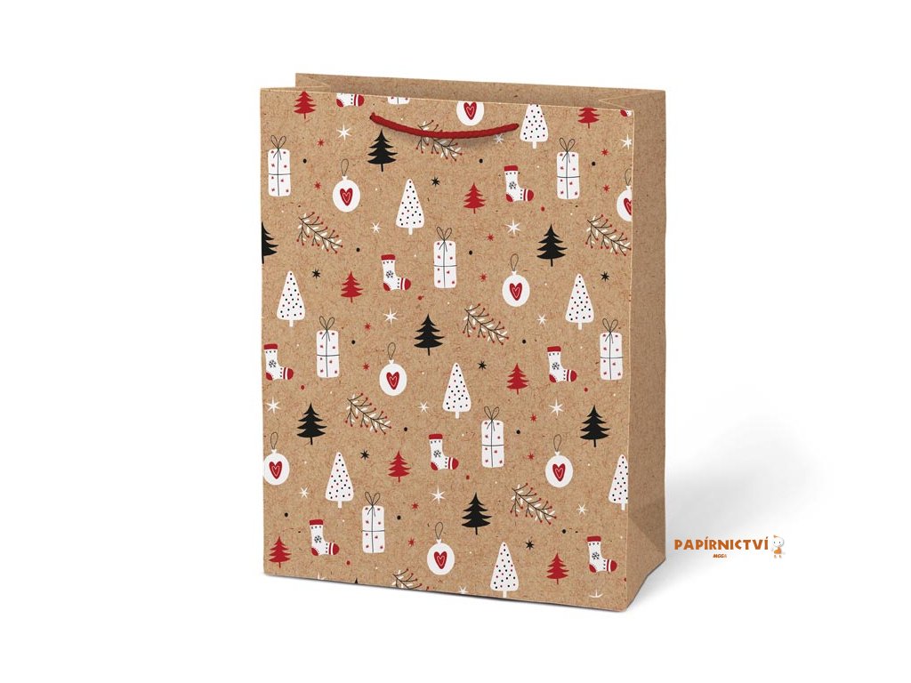 Vánoční dárková taška L LUX KRAFT z pevného kraftového papíru s potiskem. Je ideální na předání dárků, a velkým pomocníkem když je těžké dárek zabalit do dárkového balicího papíru. Taška má pletená textilní ucha.Barva: hnědá/přírodní