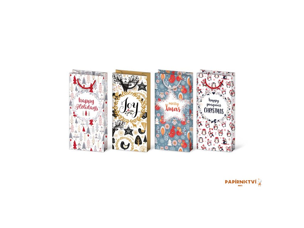 Papírová dárková taška T3 s vánočními motivy a nápisy „happy Holidays, Joy, merry Xmas, happy penguins Christmas". Vhodné na láhev vína. Taška má pevné ucho pro snadné přenášení a štítek pro vepsání jména či přání.