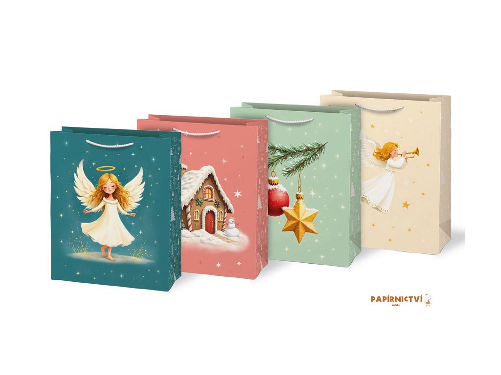 Vánoční papírová taška MFP T5 – andělská a pohádkováNechte dárky vyniknout v prostorné dárkové vánoční papírové tašce MFP T5. Pastelové motivy s anděly, perníkovou chaloupkou a vánočními ozdobami dodají balení něhu i kouzlo Vánoc. Díky většímu rozměru pohodlně pojme i větší překvapení, a přitom vypadá elegantně.