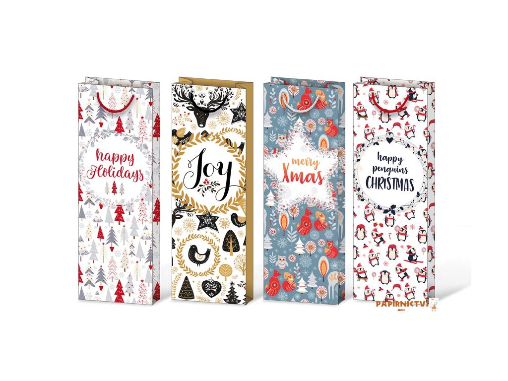 Papírová dárková taška T12 s vánočními motivy a nápisy „happy Holidays, Joy, merry Xmas, happy penguins Christmas. Vhodná na láhev vína. Taška má pevné ucho pro snadné přenášení a štítek pro vepsání jména či přání.Gramáž: 157 g