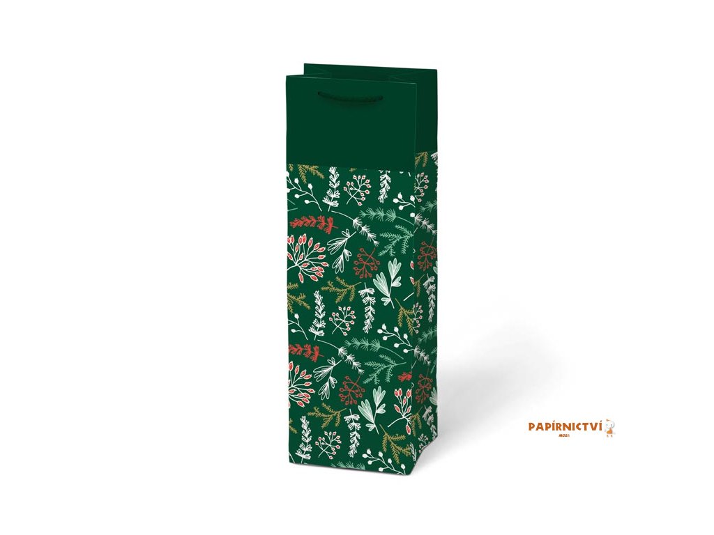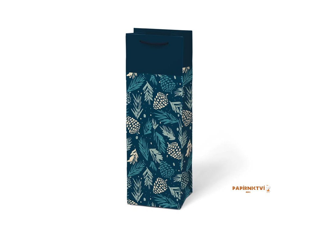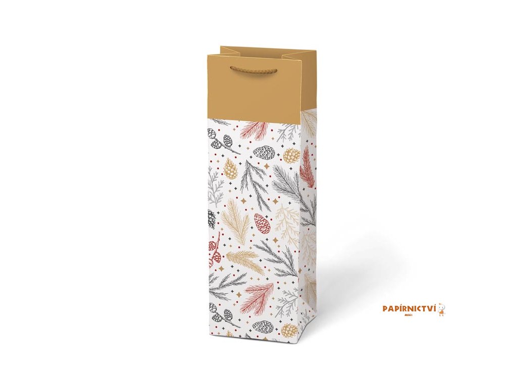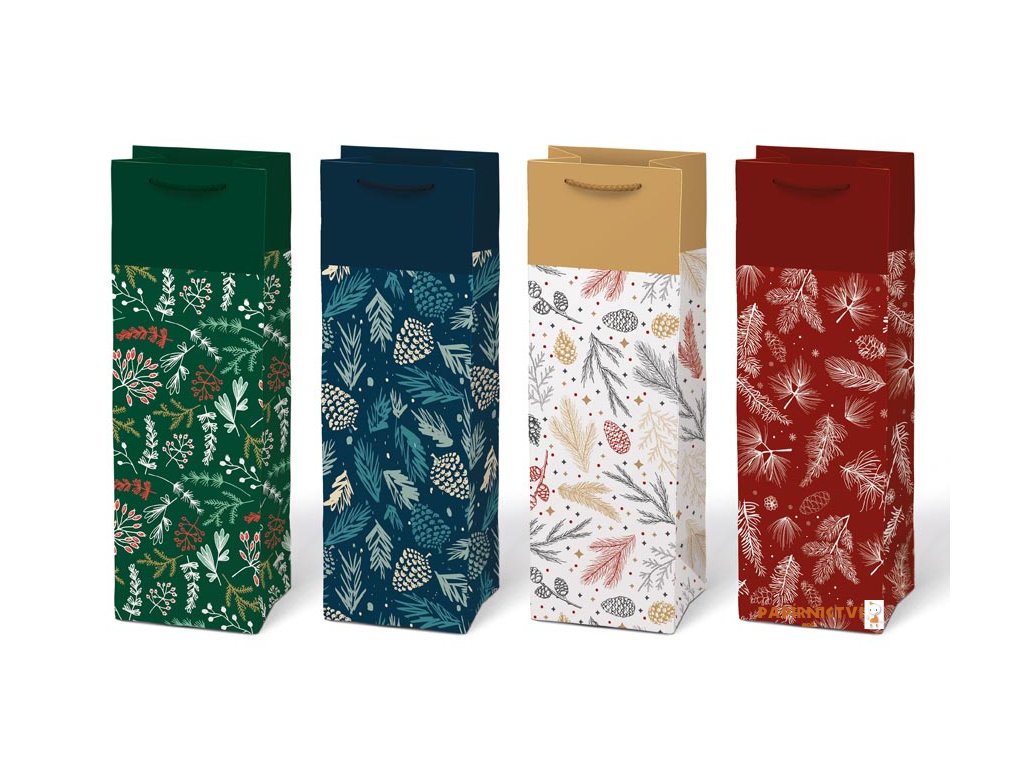Vánoční dárková taška MFP T12 – stylový obal pro láhevDarujte lahev vína nebo sektu s elegancí. MFP přináší vánoční dárkovou papírovou tašku ve čtyřech elegantních designech s motivy jehličí, větviček a šišek.