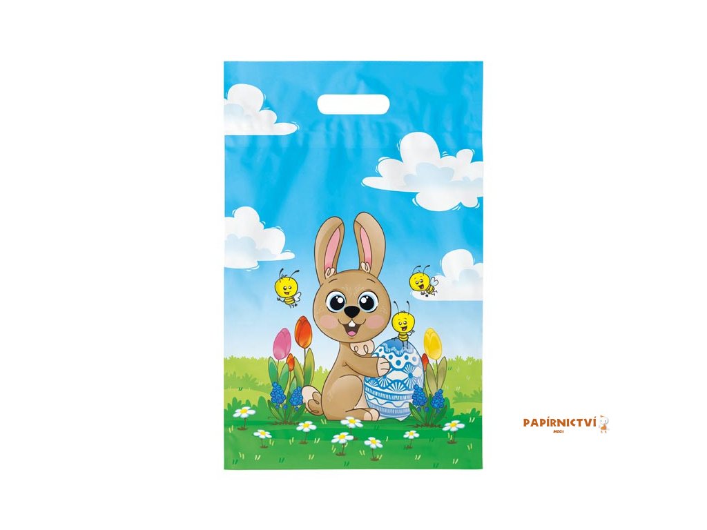 Díky svým větším rozměrům pohodlně pojme dárečky, sladkosti nebo bohatou výslužku. Praktická rukojeť zajistí snadné přenášení, zatímco veselý jarní motiv s roztomilým zajíčkem a květinami dodá sváteční náladě ten správný šmrnc.