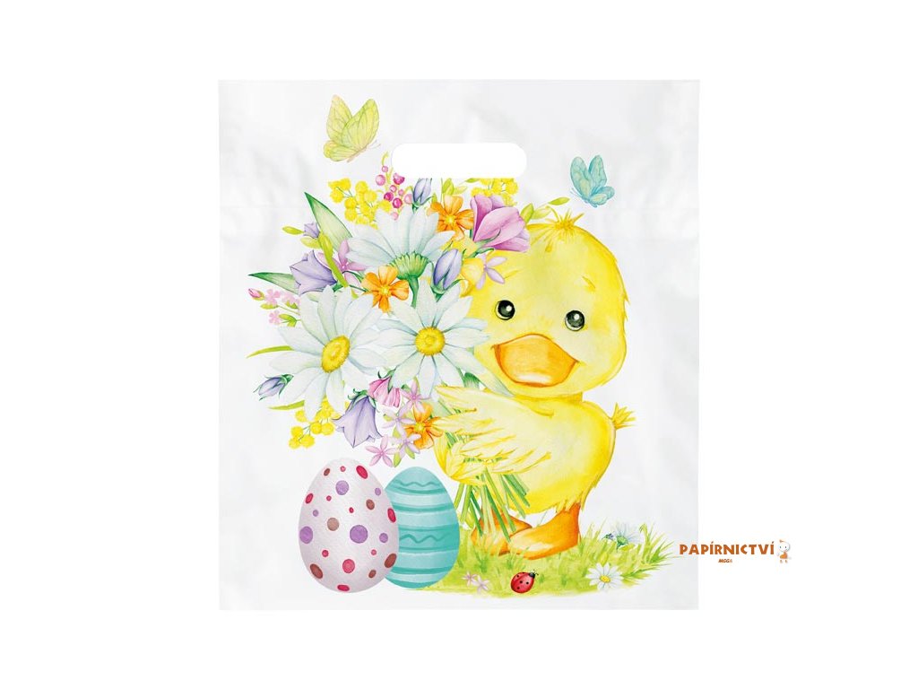 Igelitová taška s průhmatem s velikonočním motivem kraslic, kachňátka a květin. Ideální pro vytváření čokoládových balíčků pro děti!