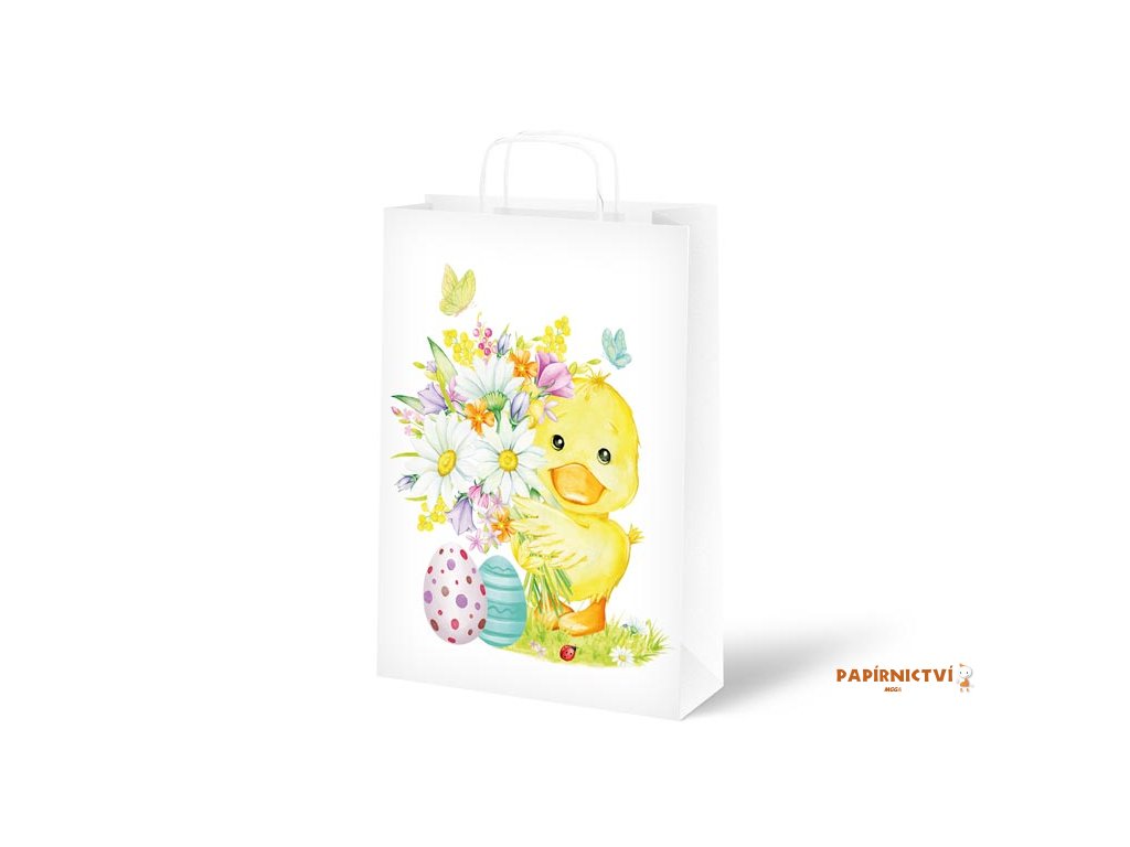 Velikonoční dárková papírová taška v bílé barvě s motivem kraslic, kachňátka a květin. Ideální pro vytváření čokoládových balíčků pro děti!