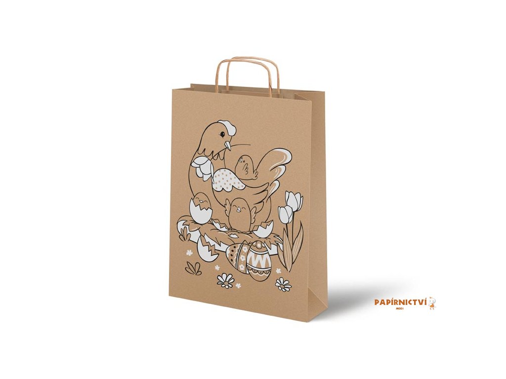 Velikonoční dárková papírová taška s motivem slepičky, kuřátka a velikonočního vajíčka. Ideální na velikonoční nadílku malé i velké koledníky.