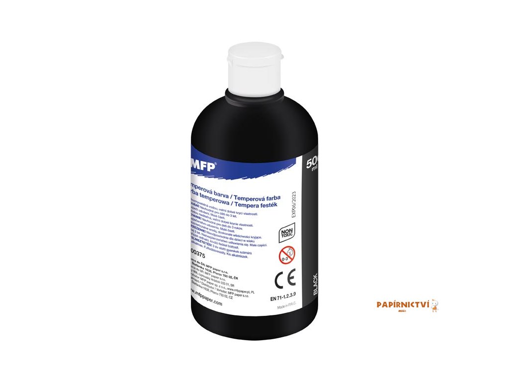 Temperové barvy MFP 500 ml - černá. Temperové barvy jsou připravené k okamžitému malování, snadno se používají a míchají. Jsou v pračce vypratelné z většiny textilií, je dobré před praním skvrny předčistit ručně mýdlem. Vysoká hodnota pigmentu v barvě zaručuje maximální krycí vlastnosti a kvalitu. Barvy jsou výborně odolné proti vyblednutí. Díky většímu balení jsou tyto barvy vhodné pro školy, školky a různé umělecké kroužky.