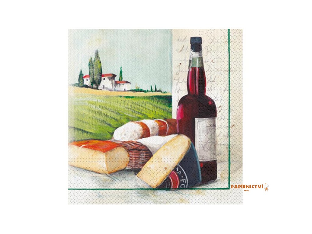 Celoroční ubrousek s motivem sýrů a vínaUbrousek, který vás přenese přímo do srdce Toskánska. Malebná krajina s cypřiši, láhev červeného vína, sýry a čerstvé pečivo vytváří atmosféru pohodových chvil strávených s přáteli u dobrého jídla. Skvěle se hodí nejen na letní posezení na terase, ale i na slavnostní večeře či pikniky.