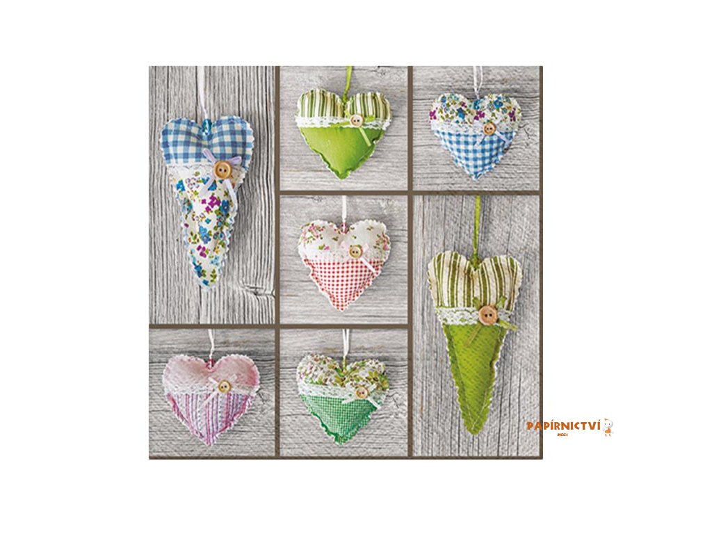 Celoroční ubrousek s látkovými srdíčkyVytvořte doma atmosféru pohody a romantiky. Papírový ubrousek s motivem barevných látkových srdíček na dřevěném podkladu působí útulně a venkovsky, takže se skvěle hodí pro rodinné oslavy, posezení s přáteli i slavnostní příležitosti.