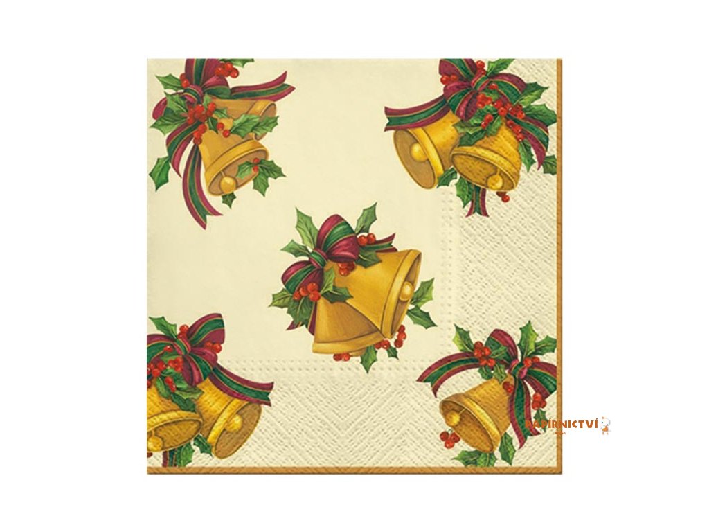 Vánoční ubrousek se zlatými zvonkyVánoční ubrousek je krásným doplňkem svátečního stolování. Motiv tradičních vánočních zvonků se zelenými lístky cesmíny, červenými bobulkami a barevnou stuhou vnese do vašeho domova kouzlo adventního času.