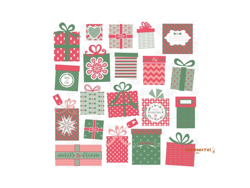 Papírový vánoční ubrousek. Ubrousek je kvalitní z třívrstvého papíru s motivem dárků. Vytvořeni decentní vánoční atmosféry stojí na maličkostech. I taková drobnost, jako vánoční ubrousky změní ráz vašeho stolování.