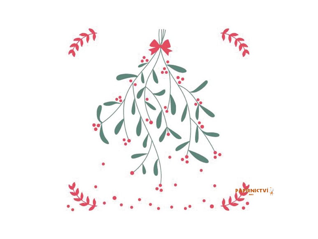 Papírový vánoční ubrousek. Ubrousek je kvalitní z třívrstvého papíru s motivem jmelí. Vytvořeni decentní vánoční atmosféry stojí na maličkostech. I taková drobnost, jako vánoční ubrousky změní ráz vašeho stolování.MOTIV: jmelí
