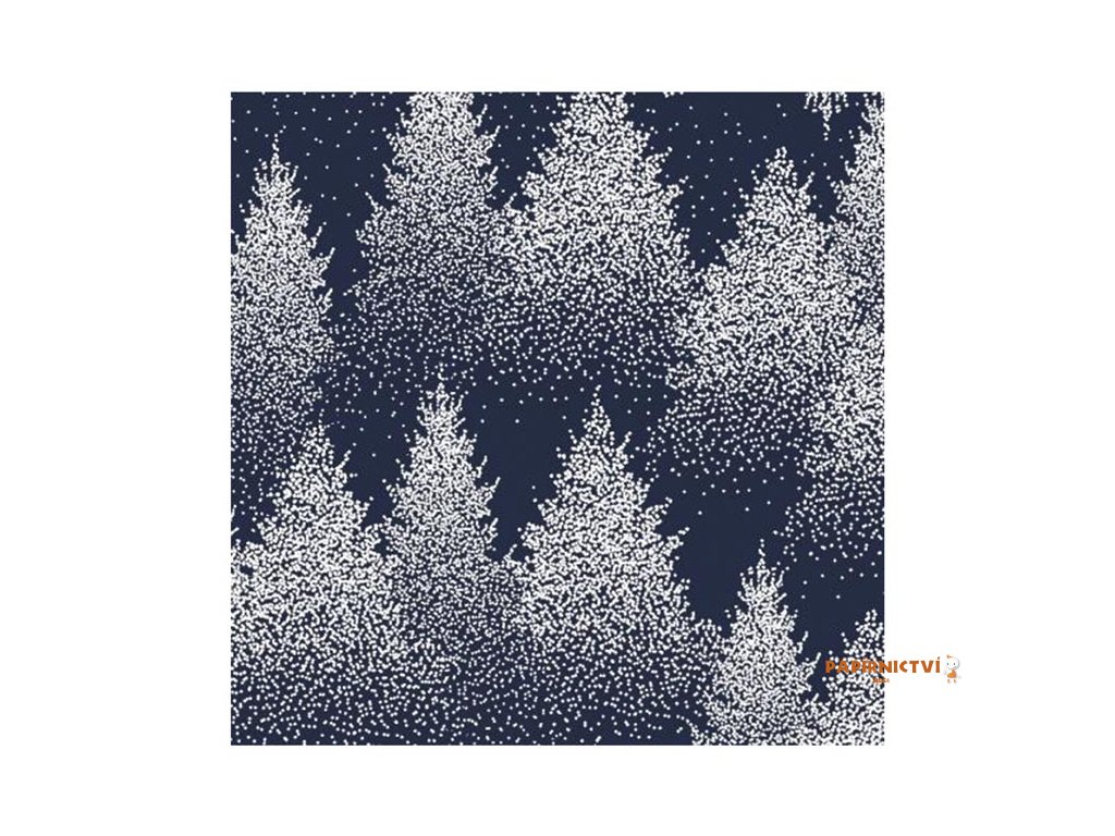 Papírový vánoční ubrousek v tmavě modré barvě. Ubrousek je kvalitní z třívrstvého papíru s motivem bílých stromků. Vytvořeni decentní vánoční atmosféry stojí na maličkostech. I taková drobnost, jako vánoční ubrousky změní ráz vašeho stolování.MOTIV: stromky