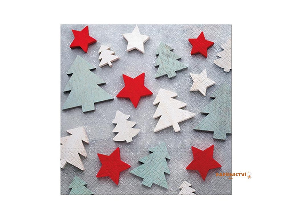 Vánoční ubrousek se stromky a hvězdičkamiOriginální ubrousek s motivem barevných stromečků a hvězdiček přinese na váš stůl hravou, ale zároveň stylovou atmosféru. Kombinace červené, bílé a zelenošedé barvy působí moderně a hodí se jak k tradičním, tak i k minimalistickým dekoracím.