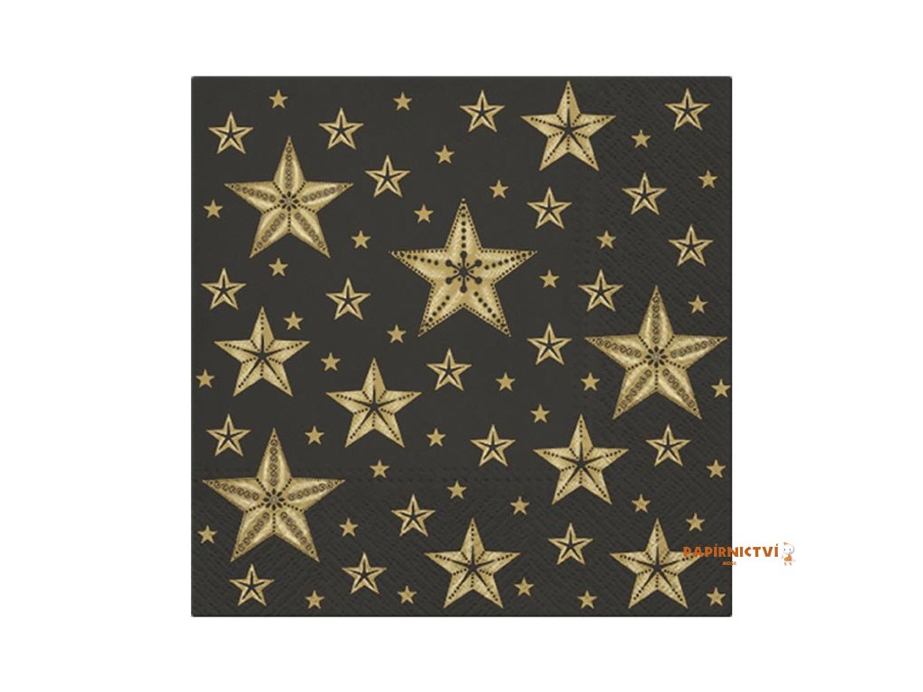 Vánoční ubrousek se zlatými hvězdamiVýrazný kontrast černého podkladu a zlatých hvězd dělá z tohoto ubrousku elegantní doplněk sváteční tabule. Motiv působí moderně, slavnostně a skvěle se hodí k prostírání v kombinaci s bílým či zlatým nádobím.