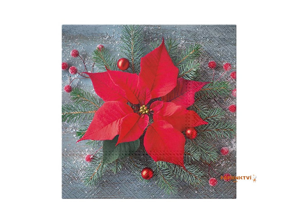 Vánoční ubrousek s motivem vánoční hvězdyVýrazný červený květ vánoční hvězdy na ubrousku okamžitě upoutá pozornost a stane se dominantou sváteční tabule. Zelené větvičky jehličí doplněné drobnými červenými ozdobami dodávají motivu slavnostní i přírodní nádech.