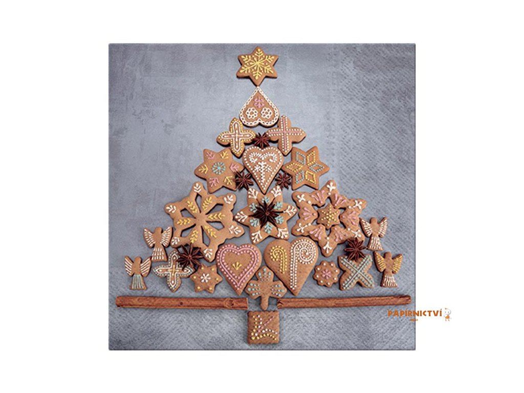 Vánoční ubrousek se zimním motivem perníčkůZpříjemněte si sváteční chvíle originálním vánočním ubrouskem s motivem perníkového stromečku. Barevné perníčky ve tvaru hvězdiček, srdíček a andílků krásně vynikají na šedém podkladu a dodají vaší tabuli hřejivý a voňavý nádech tradičních Vánoc.