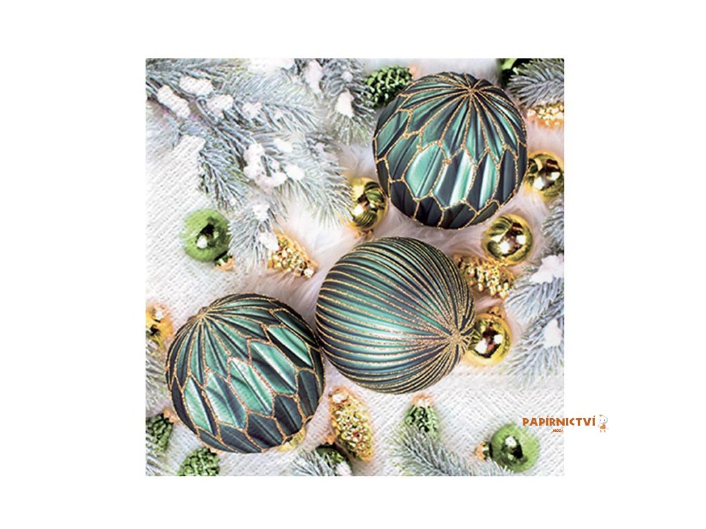 Vánoční ubrousek s elegantními vánočními ozdobamiDopřejte svému stolu slavnostní vzhled. Tento ubrousek zdobí tmavě zelené kouličky se zlatými detaily, doplněné o lesklé ozdoby, šišky a zasněžené větvičky jehličí. Kombinace zelené a zlaté působí luxusně a podtrhne výjimečnou atmosféru vánočních svátků.