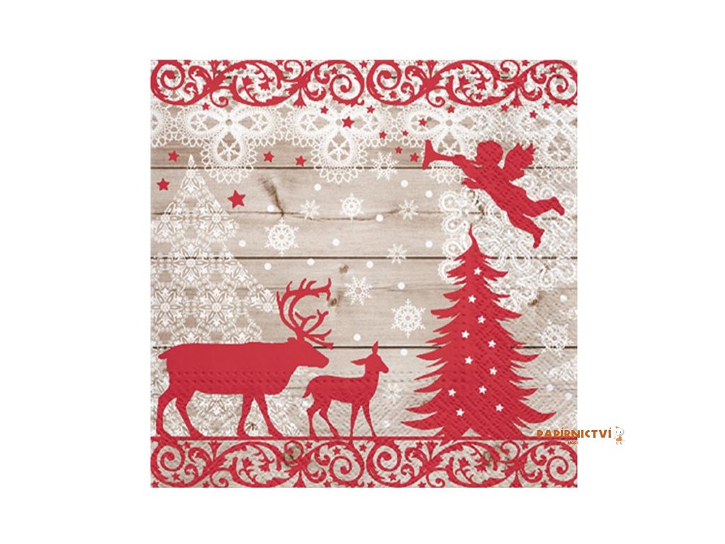 Vánoční ubrousek s motivem sobů a andělaOživte svou sváteční tabuli originálním vánočním ubrouskem, na kterém se snoubí tradiční symboly Vánoc – majestátní sob se srnkou, červený vánoční strom a anděl s trumpetou. Jemné krajkové vzory na dřevěném podkladu dodávají ubrousku rustikální i elegantní nádech.