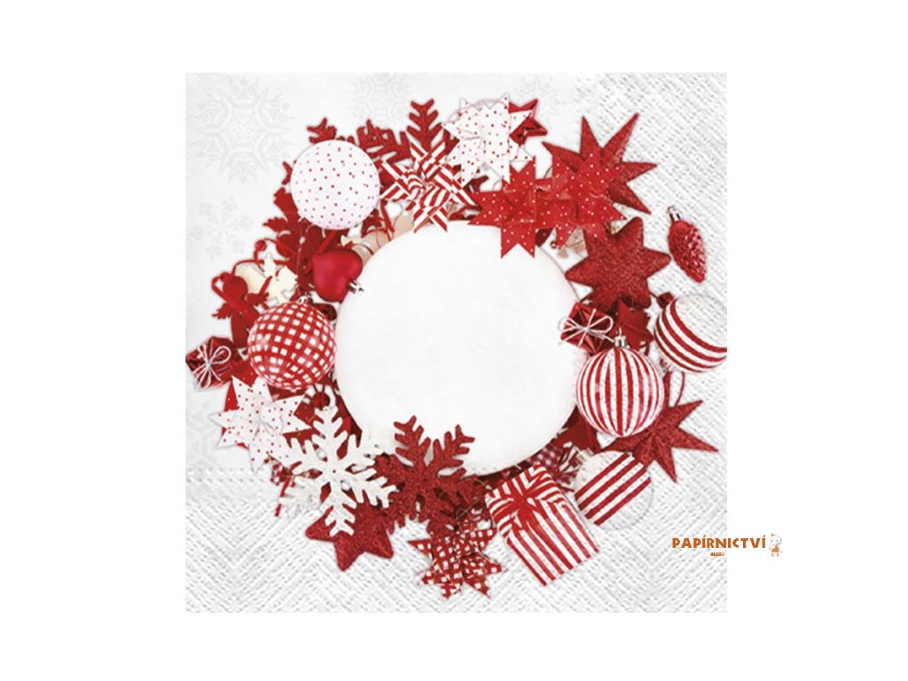 Vánoční ubrousek s vánočním věncem z ozdobOriginální vánoční ubrousek s motivem červeného věnce poskládaného z hvězd, sněhových vloček, baněk a dárků krásně doladí svátečně prostřený stůl. Kombinace tradiční červené a bílé barvy navodí veselou atmosféru a rozzáří každou tabuli.