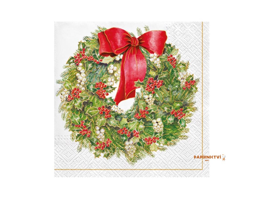 Vánoční ubrousek s motivem věnceTradiční vánoční ubrousek s věncem spleteným z jehličí a cesmíny, ozdobený červenými bobulemi, bílými plody a výraznou červenou mašlí. Tento klasický motiv v sytých barvách vnese na váš stůl tu pravou sváteční náladu.