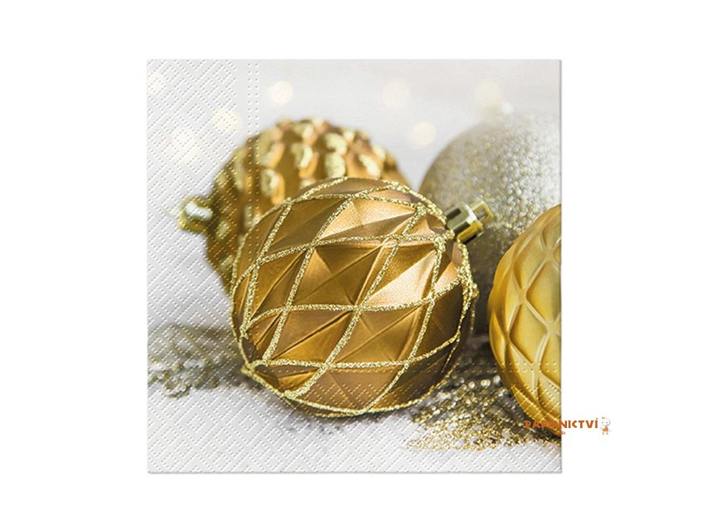 Vánoční ubrousek se zlatými vánočními ozdobamiTento vánoční ubrousek se zlatými ozdobami dodá vašemu stolování slavnostní vzhled a nádech elegance. Motiv zlatých ozdob navíc působí univerzálně, takže jej snadno sladíte s tradiční i moderní výzdobou.