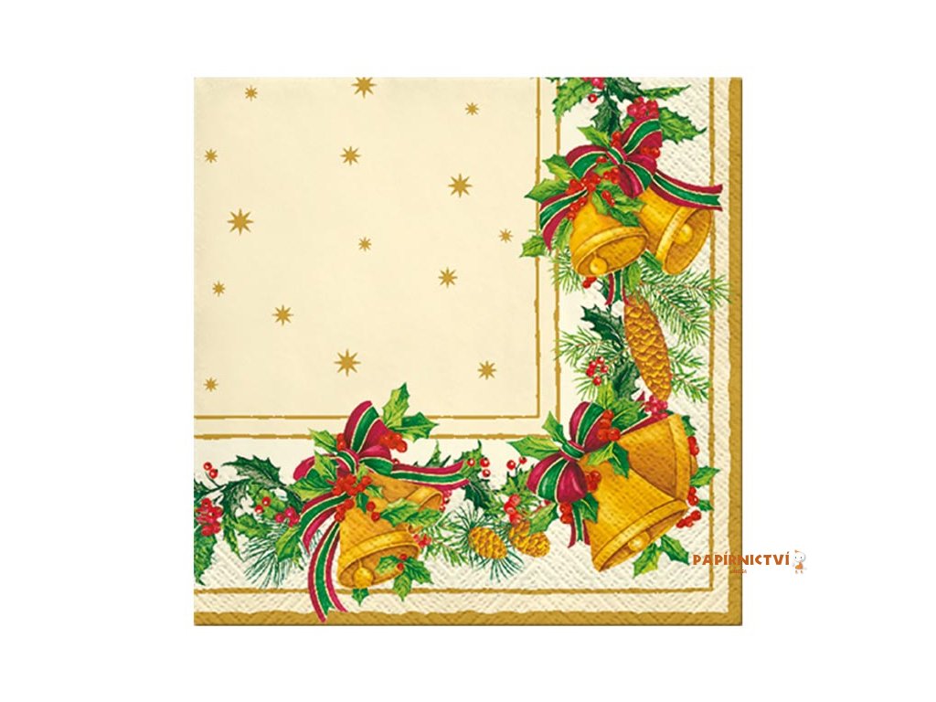 Vánoční ubrousek se zlatými zvonky a hvězdičkamiDodejte svému stolu nádech opravdového svátečního kouzla. Tento ubrousek kombinuje motiv tradičních zlatých zvonků s cesmínou, šiškami a větvičkami jehličí, doplněnými jemnými hvězdičkami na krémovém podkladu. Celkový design působí elegantně a slavnostně, přesně tak, jak si vánoční chvíle zaslouží.
