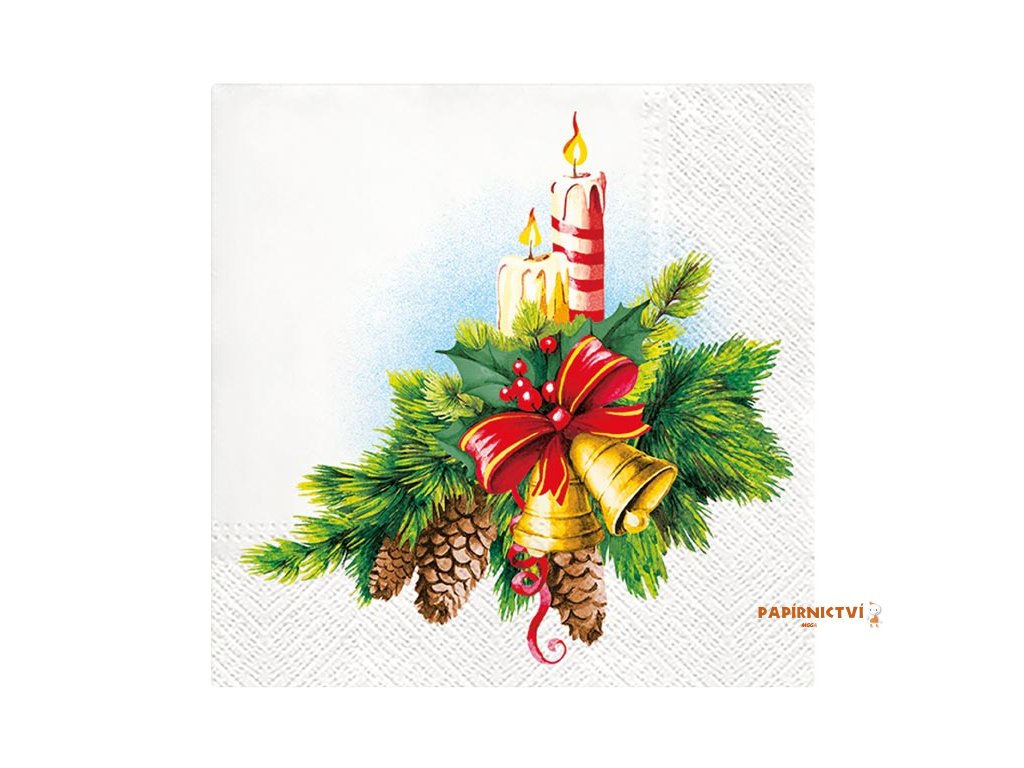 Papírový vánoční ubrousek s motivem vánočního svícnu z větviček jehličí a šišek, ozdobený zlatými zvonky s červenou mašlí a dvěma svíčkami. Je vyroben z velmi kvalitního třívrstvého papíru. Tento ubrousek se hodí pro vánoční slavnosti, kde jeho tradiční symboly a barevná kombinace přispějí k vytvoření příjemné a hřejivé atmosféry na slavnostně prostřeném stole.MOTIV: vánoční svícen