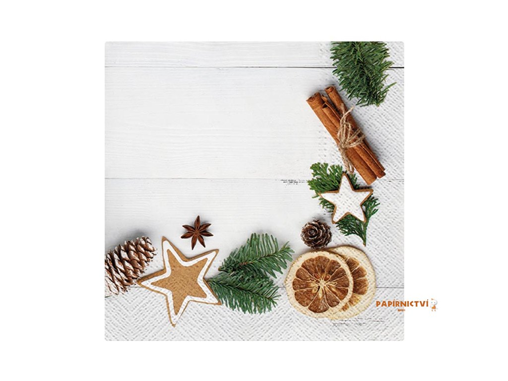 Papírový vánoční ubrousek s přírodním motivem skořice, větviček jehličí, šišek, sušeného pomeranče a perníčku. Je vyroben z velmi kvalitního třívrstvého papíru. Tento ubrousek je ideální pro sváteční stolování během Vánoc, kde jeho jednoduchý, ale stylový design doplní vánoční výzdobu. Je vhodný pro každou příležitost, kdy chcete vytvořit hřejivou a útulnou atmosféru.POČET UBROUSKŮ V BALENÍ: 20 ks