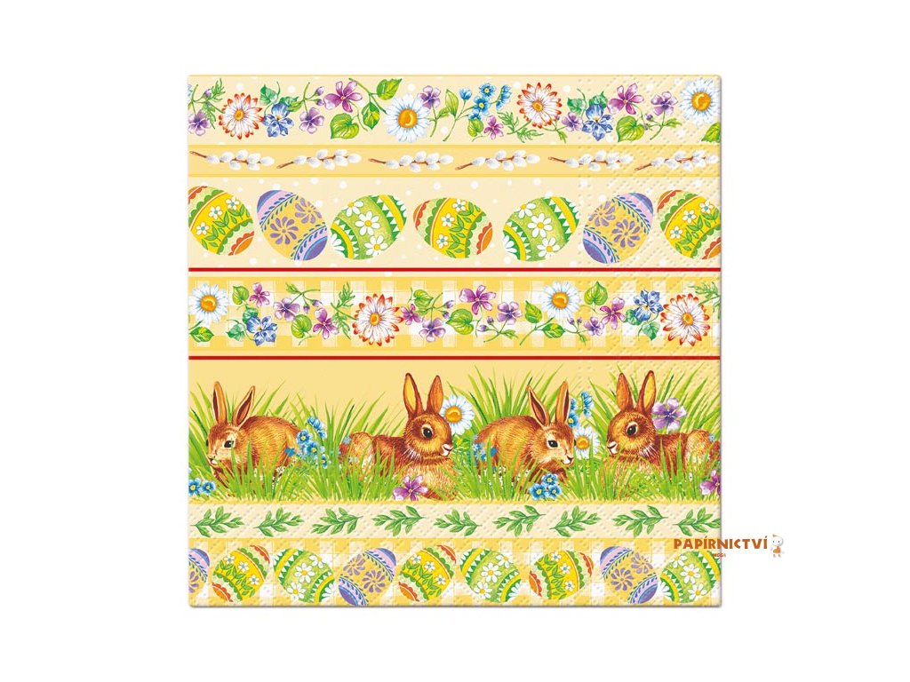 Papírový velikonoční ubrousek. Krásné velikonoční ubrousky s obrázky květin, kraslic a zajíců dodají prostřenému stolu nádech přicházejícího jara a vykouzlí příjemnou atmosféru u slavnostního oběda nebo večeře. Ubrousek je kvalitní z třívrstvého papíru. Vhodný i na ubrouskovou techniku a různé dekorace.