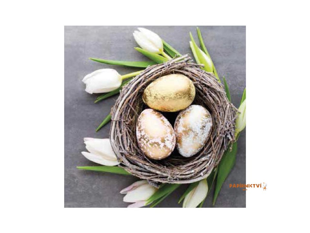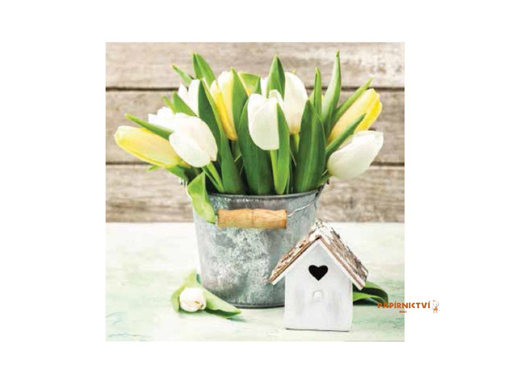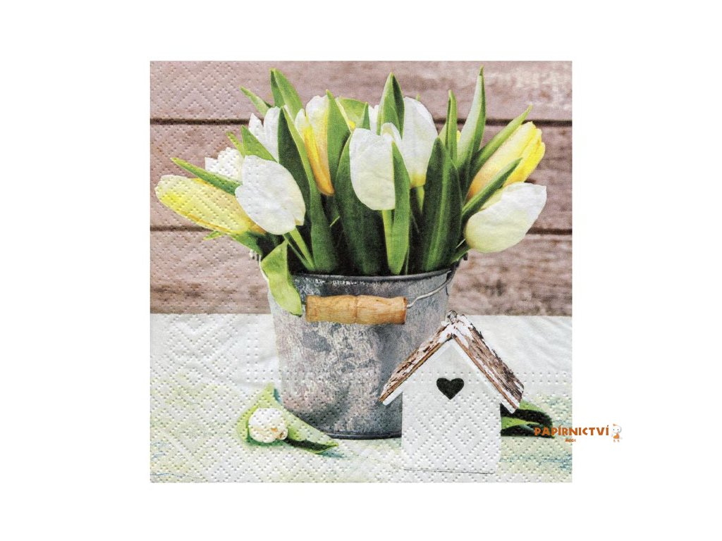Papírový velikonoční ubrousek. Krásné velikonoční ubrousky dodají prostřenému stolu nádech přicházejícího jara a vykouzlí příjemnou atmosféru u slavnostního oběda nebo večeře. Ubrousek je kvalitní z třívrstvého papíru.MOTIV: tulipány, kraslice
