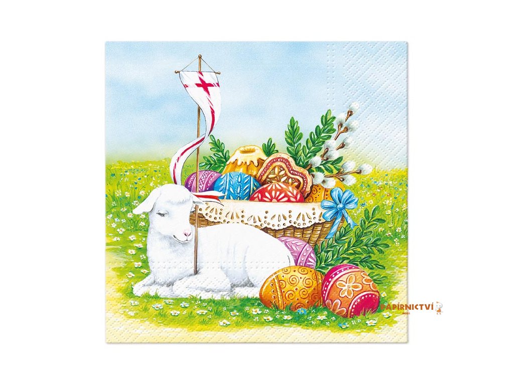 Papírový velikonoční ubrousek. Krásné velikonoční ubrousky s obrázkem beránka a kraslic dodají prostřenému stolu nádech přicházejícího jara a vykouzlí příjemnou atmosféru u slavnostního oběda nebo večeře. Ubrousek je kvalitní z třívrstvého papíru. Vhodný i na ubrouskovou techniku a různé dekorace.