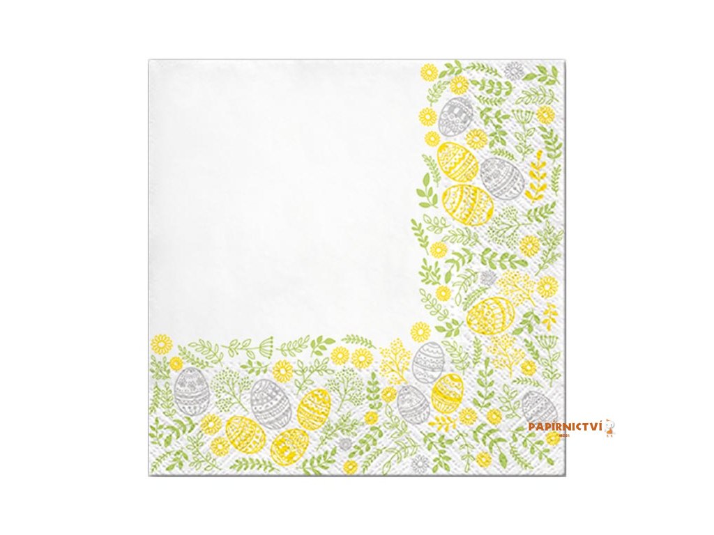 Papírový velikonoční ubrousek. Ubrousky se zářivou bordurou jarních kvítků a vajíček jsou stylovým doplňkem na váš velikonoční stůl. Ubrousek je kvalitní z třívrstvého papíru. Vhodný i na ubrouskovou techniku.