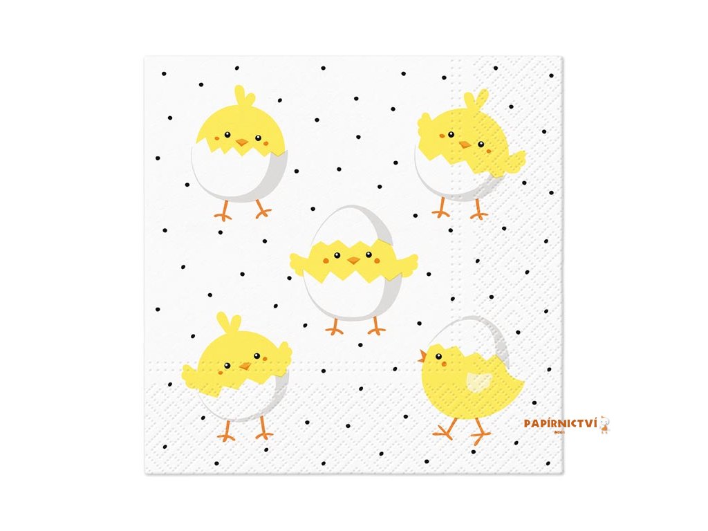 Papírový velikonoční ubrousek. Krásné velikonoční ubrousky s obrázky kuřátek ve skořápce dodají prostřenému stolu nádech přicházejícího jara a vykouzlí příjemnou atmosféru u slavnostního oběda nebo večeře. Ubrousek je kvalitní z třívrstvého papíru. Vhodný i na ubrouskovou techniku a různé dekorace.