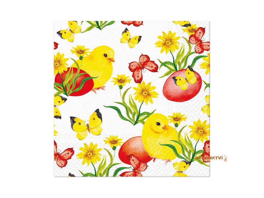Papírový velikonoční ubrousek. Krásné velikonoční ubrousky s obrázky kuřátek, květin, motýlů a kraslic dodají prostřenému stolu nádech přicházejícího jara a vykouzlí příjemnou atmosféru u slavnostního oběda nebo večeře. Ubrousek je kvalitní z třívrstvého papíru. Vhodný i na ubrouskovou techniku a různé dekorace.