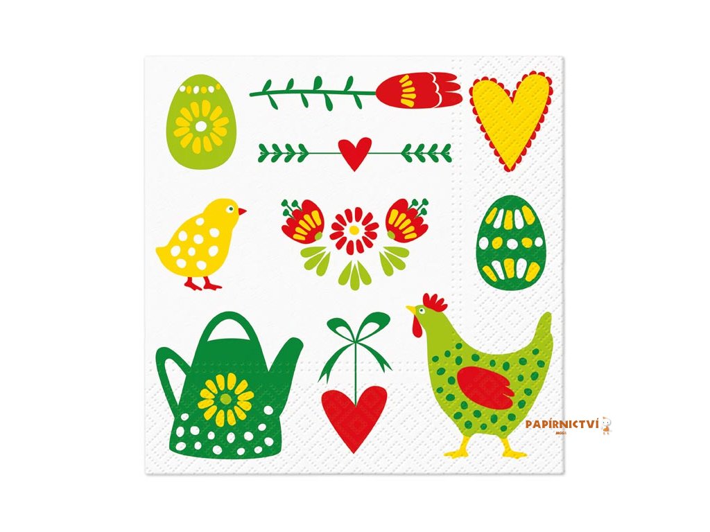 Papírový velikonoční ubrousek. Krásné velikonoční ubrousky s obrázky slepičky, kuřátka, kraslic a konve dodají prostřenému stolu nádech přicházejícího jara a vykouzlí příjemnou atmosféru u slavnostního oběda nebo večeře. Ubrousek je kvalitní z třívrstvého papíru. Vhodný i na ubrouskovou techniku a různé dekorace.