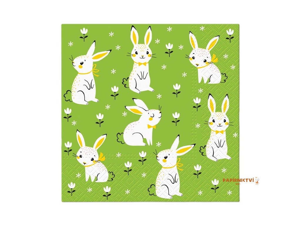 Papírový velikonoční ubrousek. Krásné velikonoční ubrousky s obrázky králíčků dodají prostřenému stolu nádech přicházejícího jara a vykouzlí příjemnou atmosféru u slavnostního oběda nebo večeře. Ubrousek je kvalitní z třívrstvého papíru. Vhodný i na ubrouskovou techniku a různé dekorace.