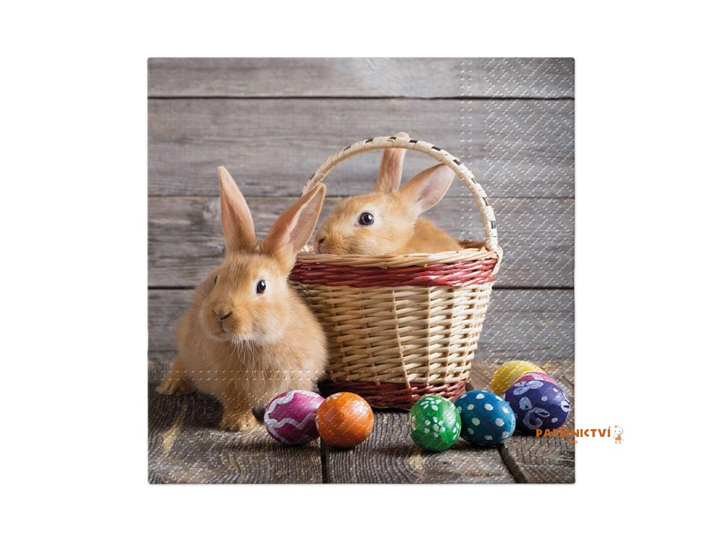 Papírový velikonoční ubrousek. Krásné velikonoční ubrousky s obrázky králíčků, kraslic a košíku dodají prostřenému stolu nádech přicházejícího jara a vykouzlí příjemnou atmosféru u slavnostního oběda nebo večeře. Ubrousek je kvalitní z třívrstvého papíru. Vhodný i na ubrouskovou techniku a různé dekorace.MOTIV: králíčci, kraslice, košík
