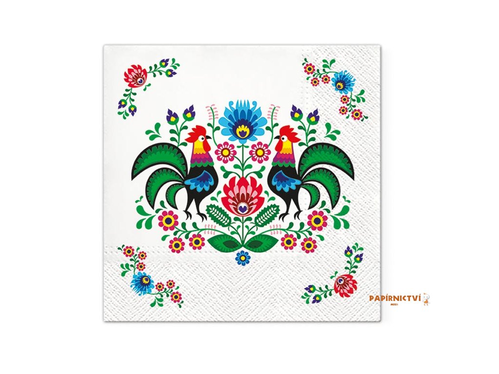 Vneste na svůj stůl kousek lidové tradice! Tento velikonoční ubrousek s barevnými kohoutky a pestrými květinovými vzory je ideální pro velikonoční stolování, jarní oslavy nebo jakékoli setkání, které chcete ozvláštnitfolklórním kouzlem a veselou atmosférou.