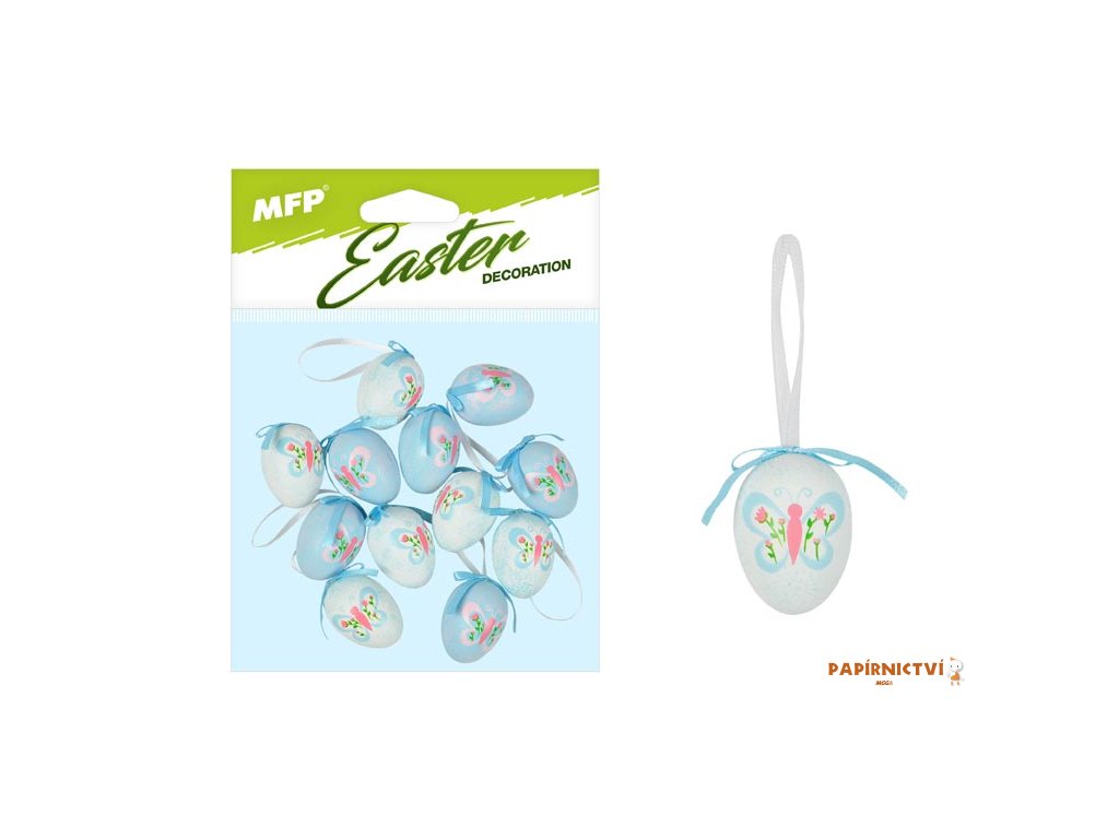 Vajíčka plastová v bílomodrých barvách na zavěšení. Krásná velikonoční dekorace barevných vajíček s motýlky a se stuhou na zavěšení poslouží jako dekorace do exteriéru nebo interiéru. Dekorace má provázek na zavěšení. Nalaďte se s námi na Velikonoce!