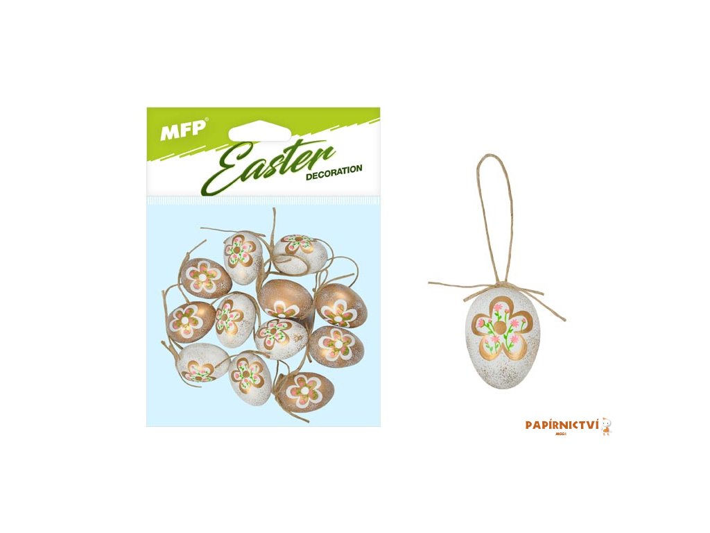 Vajíčka plastová v bílozlatých barvách na zavěšení. Krásná velikonoční dekorace kropenatých kraslic s motivem květu a s přírodním provázkem na zavěšení. Poslouží jako dekorace do exteriéru nebo interiéru. Dekorace má provázek na zavěšení. Nalaďte se s námi na Velikonoce!
