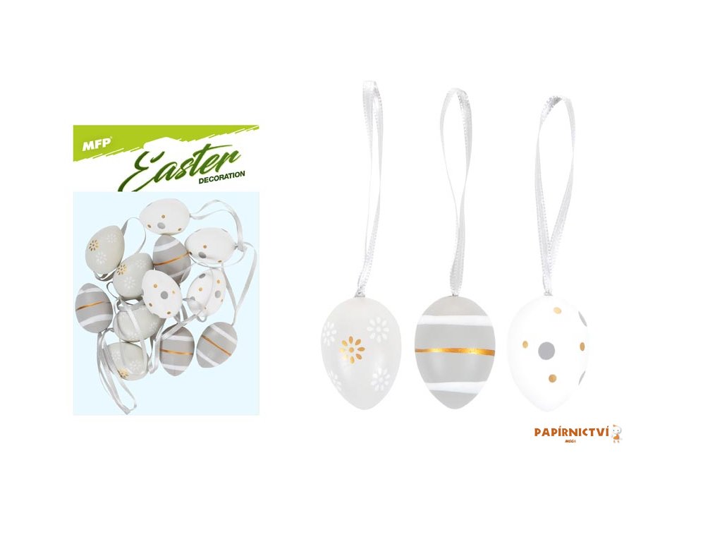 Velikonoční plastová vajíčka s malovanými motivy, v bílé a šedé barvě. Vajíčka mají stužku na pověšení. Vyzdobte si svůj domov krásnými velikonočními vajíčky, které Vám vytvoří okouzlující atmosféru Velikonoc! Tuto dekoraci můžete použít na dekorování velikonočních věnců nebo větviček.