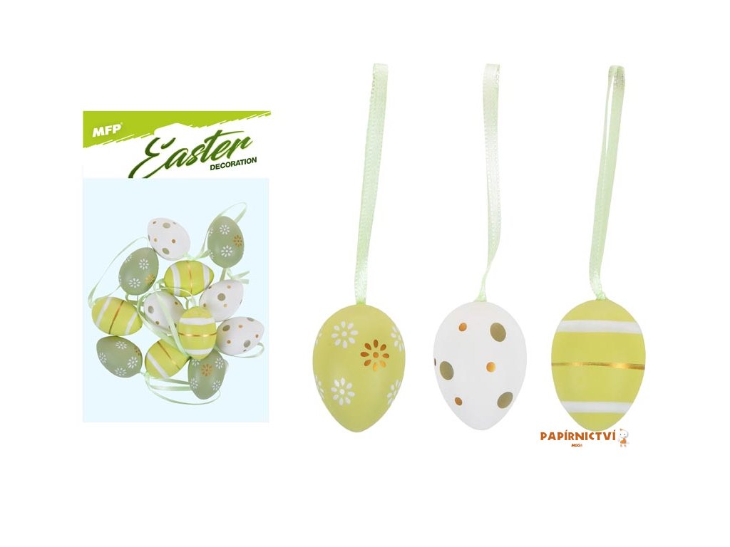 Velikonoční plastová vajíčka s malovanými motivy, v zelené a bílé barvě. Vajíčka mají stužku na pověšení. Vyzdobte si svůj domov krásnými velikonočními vajíčky, které Vám vytvoří okouzlující atmosféru Velikonoc! Tuto dekoraci můžete použít na dekorování velikonočních věnců nebo větviček.