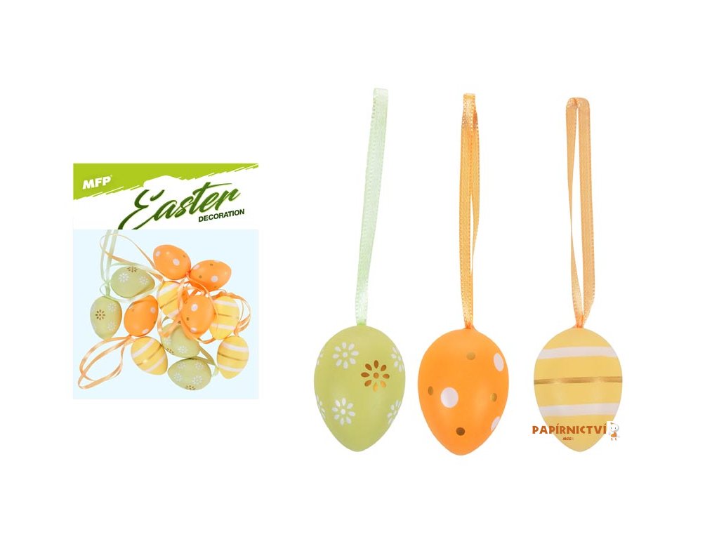 Velikonoční plastová barevná vajíčka s malovanými motivy, v zelené, žluté a oranžové barvě. Vajíčka mají stužku na pověšení. Vyzdobte si svůj domov krásnými velikonočními vajíčky, které Vám vytvoří okouzlující atmosféru Velikonoc! Tuto dekoraci můžete použít na dekorování velikonočních věnců nebo větviček.