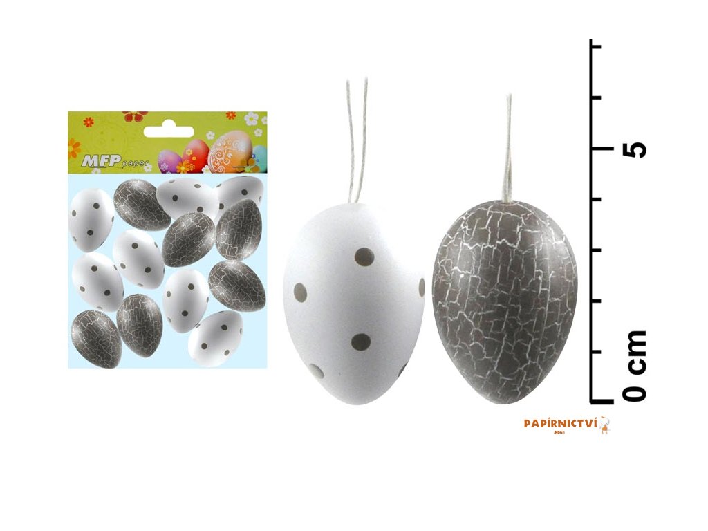 Velikonoční plastová vajíčka v bílo-šedé kombinci - pasklinky a puntíky. Vajíčka mají provázek na pověšení. Vyzdobte si svůj domov krásnými velikonočními vajíčky, které Vám vytvoří okouzlující atmosféru Velikonoc! Tuto dekoraci můžete použít na dekorování velikonočních věnců nebo větviček.