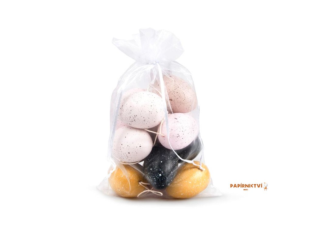 Vajíčka plastová kropenatá v mixu barev na zavěšení. Krásná velikonoční dekorace vajíček se závěsem, poslouží jako dekorace do exteriéru nebo interiéru. Dekorace má provázek na zavěšení. Vajíčka jsou uložena ve stahovacím sáčku z organzy. Nalaďte se s námi na Velikonoce!