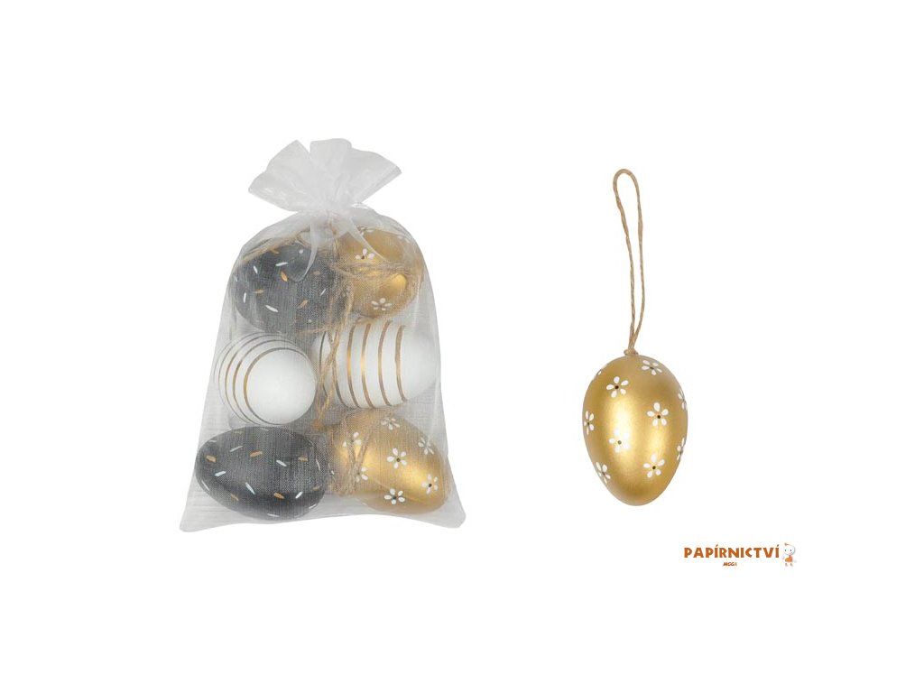 Plastová vajíčka v černozlatých barvách na zavěšení. Krásná velikonoční dekorace vajíček se závěsem, poslouží jako dekorace do exteriéru nebo interiéru. Dekorace má provázek na zavěšení. Nalaďte se s námi na Velikonoce!