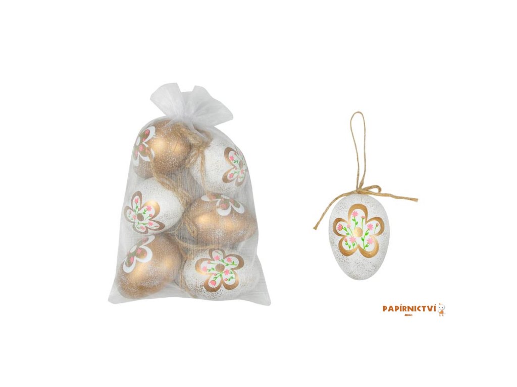Vajíčka plastová v bílozlatých barvách na zavěšení. Krásná velikonoční dekorace vajíčka se závěsem a motivem květu. Poslouží jako dekorace do exteriéru nebo interiéru. Dekorace má provázek na zavěšení. Nalaďte se s námi na Velikonoce!